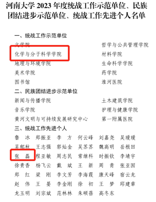 近日,我校公布了《中共河南大学委员会关于表彰2023年度统战工作示范单位、民族团结进步示范单位及统战工作先进个人的决定》,伟德betvlctor体育官网再度荣获河南大学统战工作示范单位,统战委员、副院长张磊荣获统战工作先进个人。