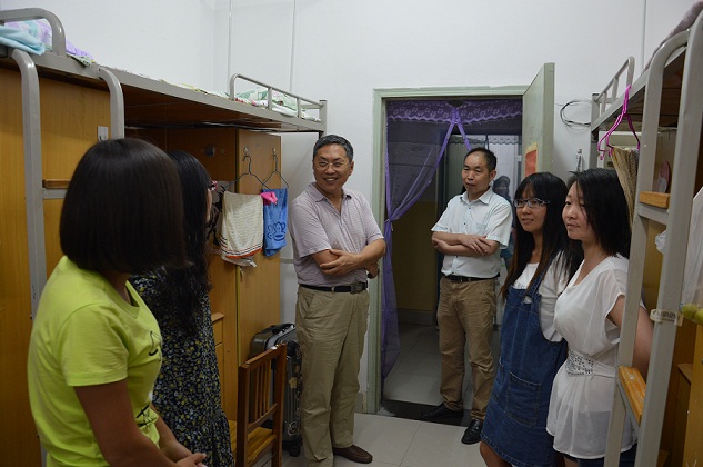 随着报道工作的顺利完成,学院领导于当日晚到新生宿舍看望新同学。每到一处,院领导与新生亲切交谈,详细地询问新同学的住宿与生活情况,并且强调学院将会努力地为同学们营造舒适的学习和生活氛围。