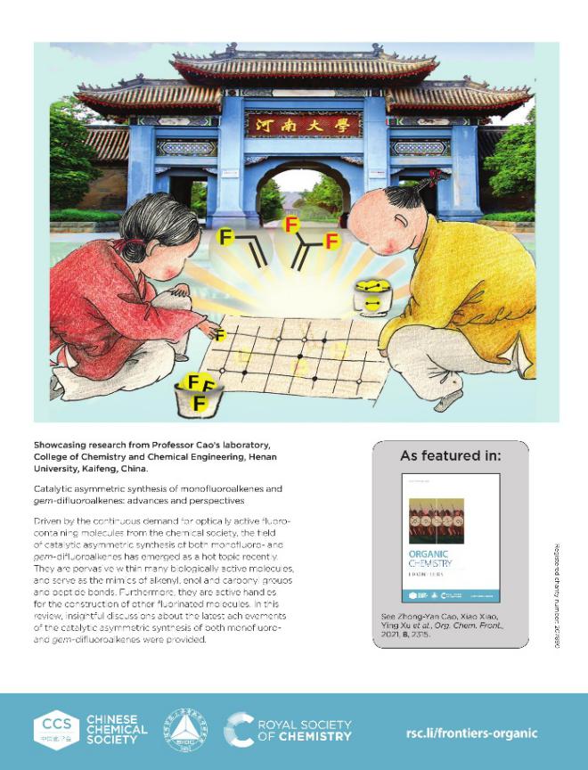 由于氟原子及含氟基团的特殊物理化学性质,在新型药剂研发以及高性能材料开发等领域选择性引入含氟基团是有效改善母体分子相关活性的重要手段。然而,自然界中天然的含氟有机物非常少,因此研究者开发通过不对称催化的方式,向有机分子中高对映选择性的引入氟原子或含氟基团用于在温和条件下实现不对称氟化、三氟甲基化、氟烷基化等反应,但对于如何立体选择性引入单氟和1,1-二氟烯基片段,仍然缺乏有效的合成手段。许英、曹中艳团队和浙江工业大学肖霄博士在前期合作的工作基础之上,详细总结了学术界关于催化不对称合成单氟烯烃和1,1-二氟烯烃的已有方法,针对催化不对称合成单氟烯烃和二氟烯烃的新策略和新方法提出了发展思路。该研究成果三位审稿人均给予了高度评价,编辑也将其选为重要论文,并邀请作为期刊封皮发表。论文封皮以河南大学标志性建筑南大门为背景制作,献礼河南大学110周年校庆。该文章在刊出之后,已有多个研究团队引用,引起了同行的关注。
