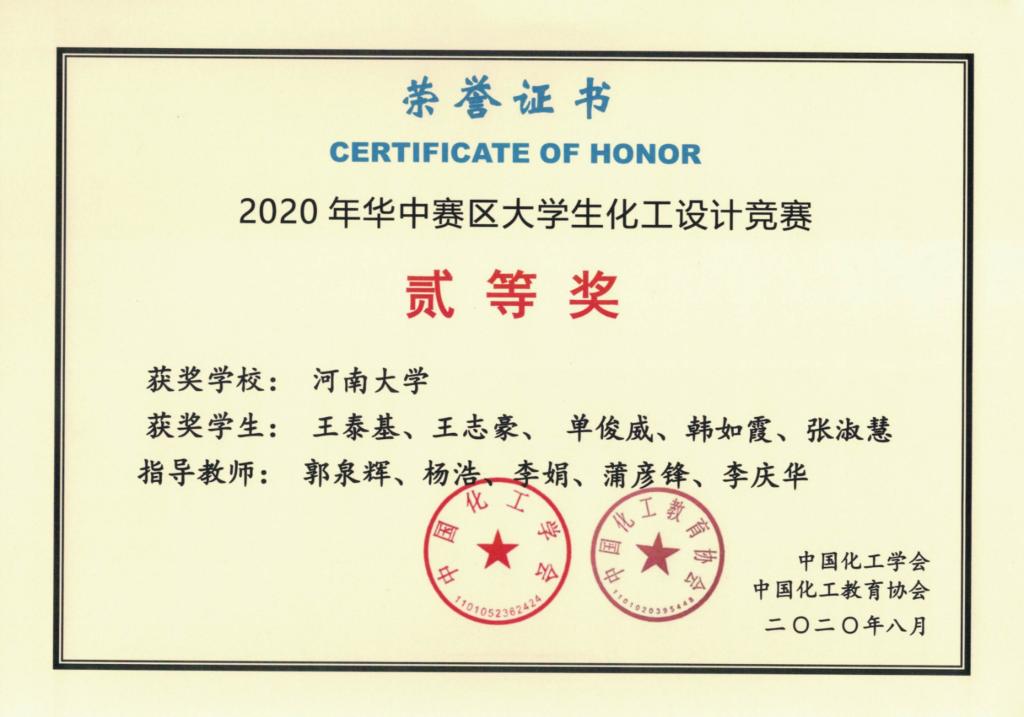 科研竞赛方面,他参加了第十四届全国大学生化工设计大赛,并取得了华中赛区二等奖的好成绩。在竞赛过程中,他能自学课程,以及完成作品所需要的软件。另外,去年的比赛受疫情的影响,作为队长的他积极协调队员的分工与配合,克服困难,最终在规定时间内高质量的完成作品。这次竞赛经历,在很大程度上提高了他的学习能力、实践能力、统筹协作能力,增强了他的工程意识、环保意识、安全意识以及团队合作意识。