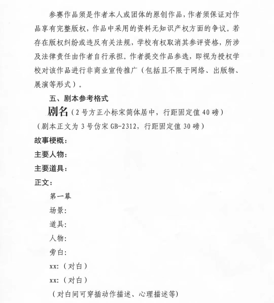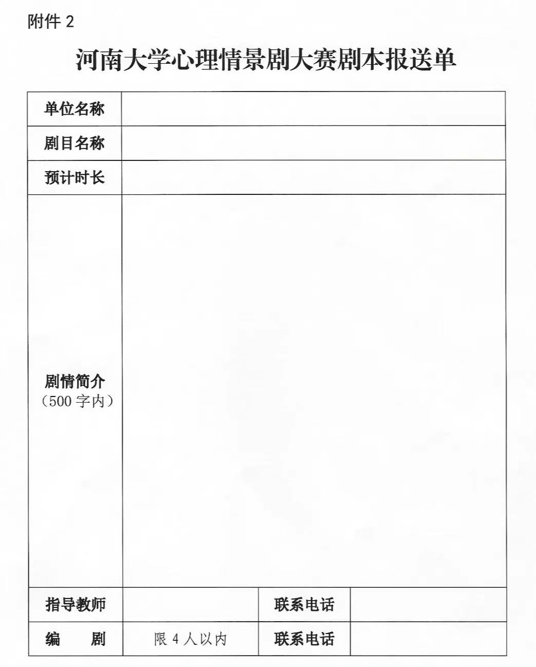 各团队于2024年4月17日前将《河南大学心理情景剧大赛剧本报送单》(附件2)及1部参赛作品剧本(.doc格式,以“负责人姓名+剧本名称”格式命名)汇总至一个文件夹,文件夹及邮件主题以“负责人姓名+心理剧参赛”格式命名,压缩发送至邮箱:793569168@qq.com。
