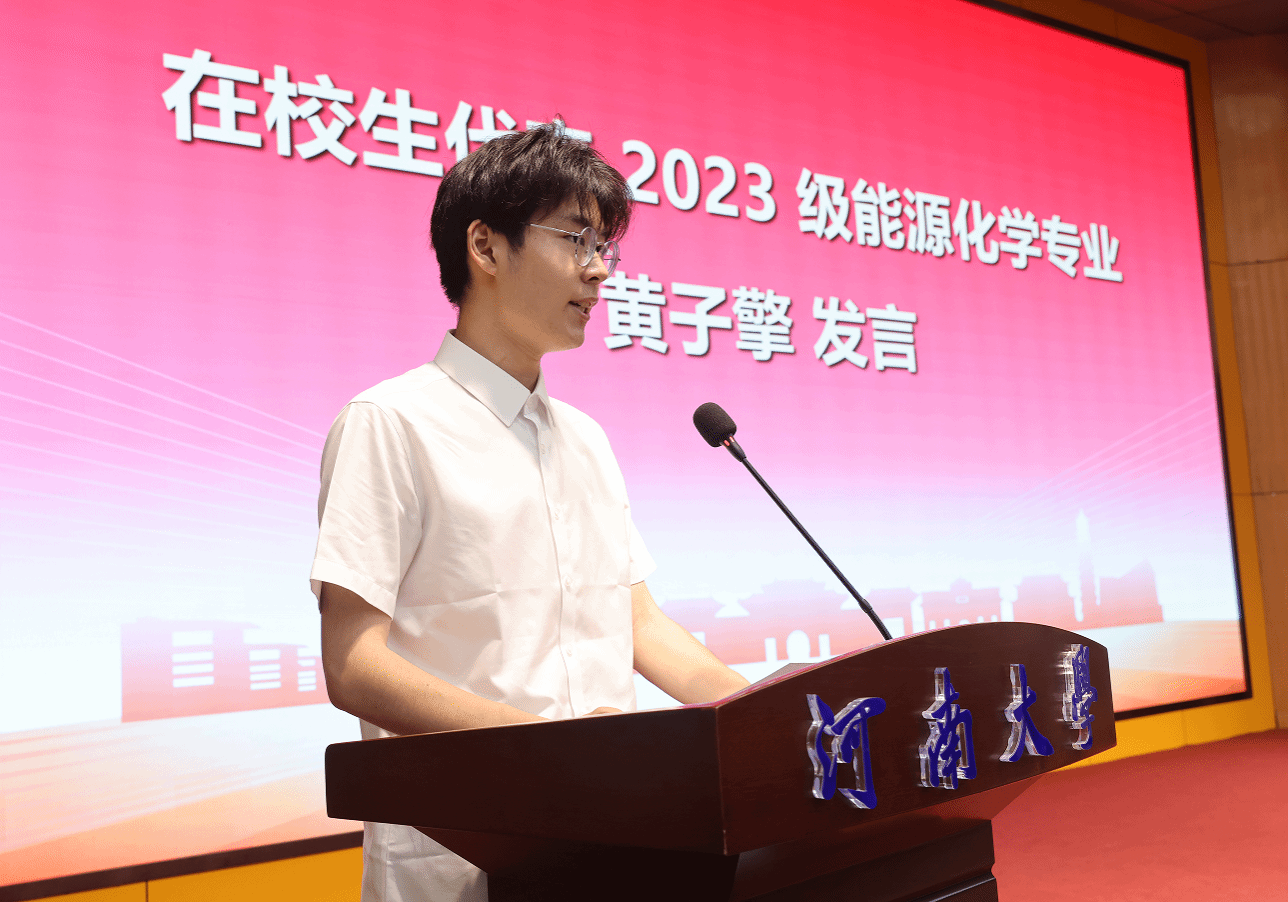 2023级能源化学专业黄子擎代表在校生发言。他回忆了与学长学姐们相处的时光以及学长学姐们曾经给予的帮助,并表示将向学长学姐学习,以饱满的热情,坚定的信念继续追寻心中的梦想,最后他代表学院在校本科生祝愿全体毕业生一帆风顺,前程似锦,归来仍是少年。
