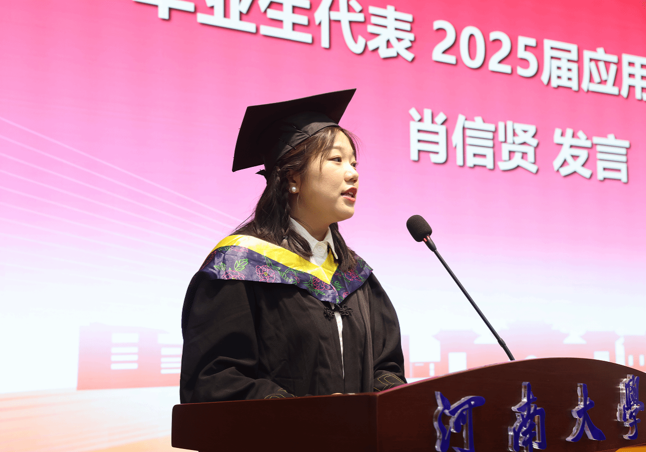 毕业生代表、国家励志奖学金获得者肖信贤在发言中深情回顾了求学四载的成长点滴,并代表全体毕业生向师长、同学表达最真挚的感谢。她祝愿每位同学不论身在何处,都要牢记初心使命,将“明德新民、止于至善”内化于心,外化于行,争做有理想,敢担当,能吃苦,肯奋斗的新时代好青年。