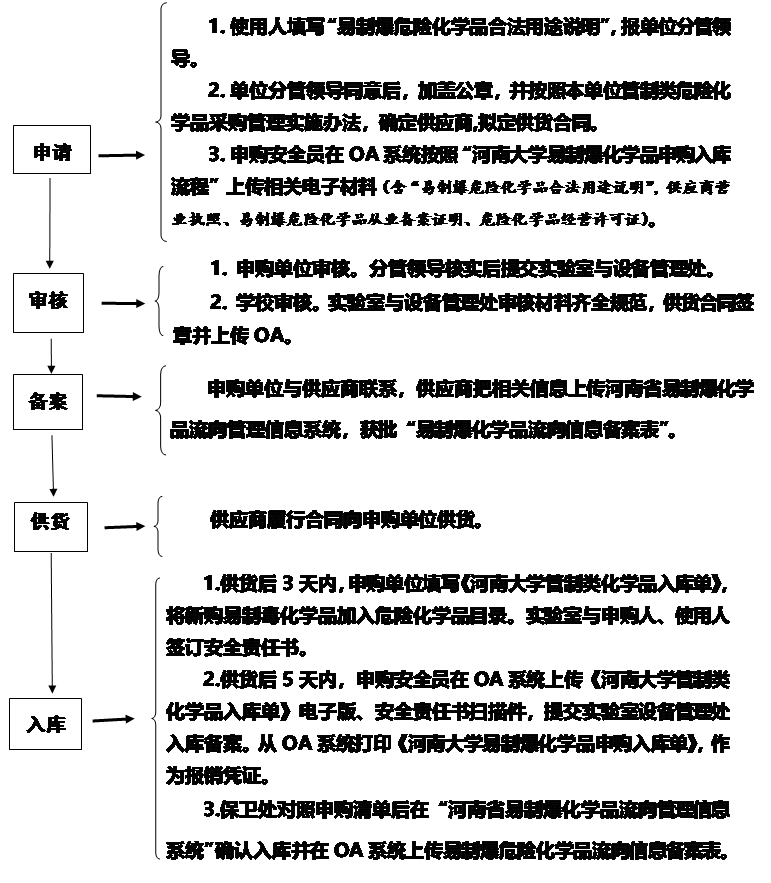 使用认真对照易制爆危险化学品名录,确定品类后,执行本流程;管制类化学品由单位统一采购、专人保管。