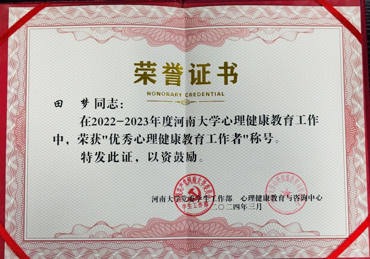 一程风雨,一程阳光;一路耕耘,一路收获。3月13日上午,学校召开2024年春季学期学生工作会议,会议表彰了各单位在2023年度学生工作中取得的优异成绩。在此次表彰中,伟德betvlctor体育官网荣获2023年第五届“书香·追梦”跟着习近平总书记学读书活动优秀组织奖、2023年第二届“阅中华·悦河大”短视频征集大赛优秀组织奖、2023年河南大学第四届讲党史校史主题演讲比赛优秀组织奖、2023年河南大学“助学圆梦,青春启航”主题征稿活动优秀组织奖、2023年暑期“资助政策乡村行”活动优秀组织奖五个奖项。田梦被评为2022-2023年度河南大学优秀心理健康教育工作者。